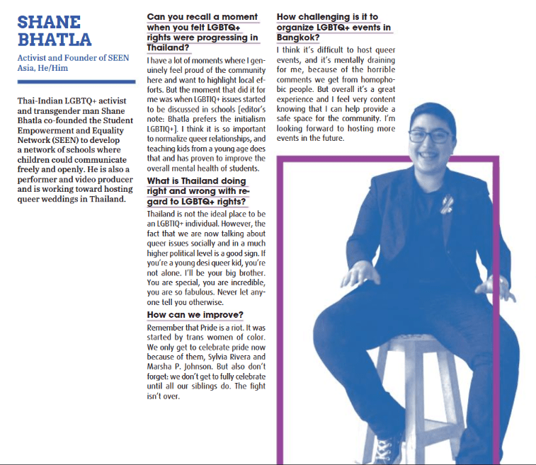 Thai-Indian LGBTQ+ activist and transgender man Shane Bhatla co-founded the Student Empowerment and Equality Network (SEEN) to develop a network of schools where children could communicate freely and openly. He is also a performer and video producer and is working toward hosting queer weddings in Thailand.